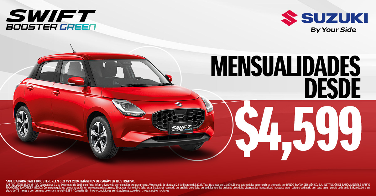 Muévete con estilo y eficiencia con Suzuki Swift Booster Green Glx Cvt 2026. Mensualidades desde $4,599 para disfrutar cada recorrido con dinamismo y confort.